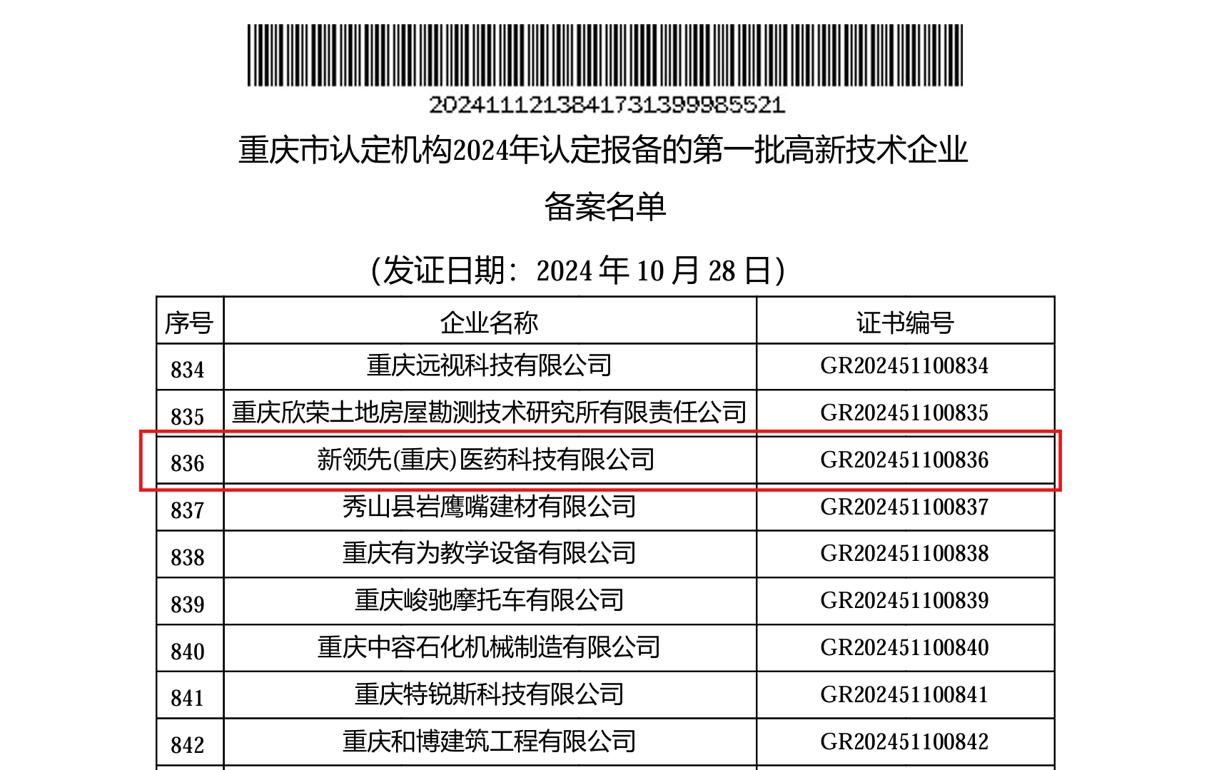 近日,國家高新企業技術認定管理工作網發布《對重慶市認定機構2024年認定報備的第一批高新技術企業進行備案的公告》,新領先(重慶)醫藥科技成功通過國家“高新技術企業”認定!