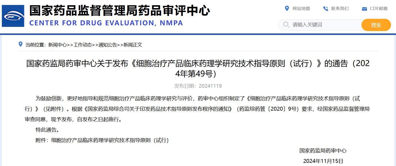 國家藥監局藥審中心關于發布《細胞治療產品臨床藥理學研究技術指導原則(試行)》的通告(2024年第49號)