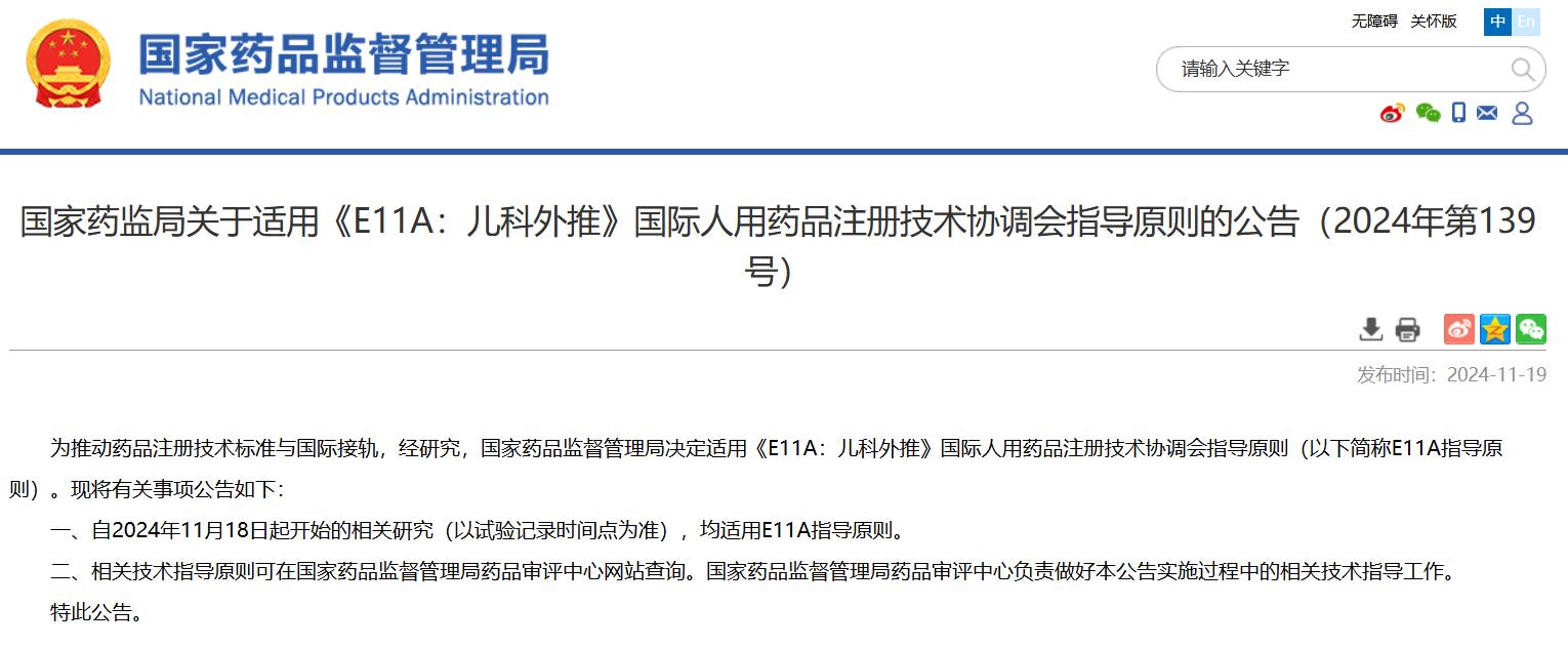 國家藥監局關于適用《E11A:兒科外推》國際人用藥品注冊技術協調會指導原則的公告(2024年第139號)