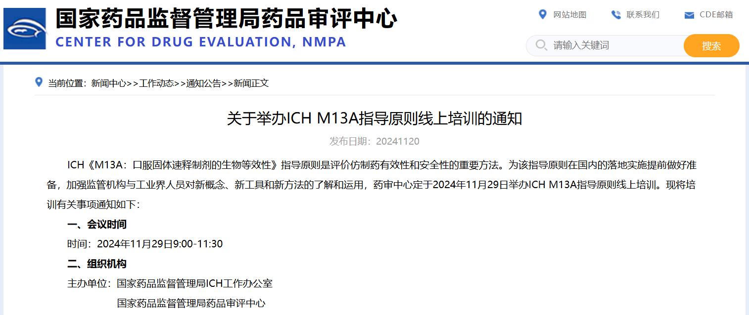 關于舉辦ICH M13A指導原則線上培訓的通知