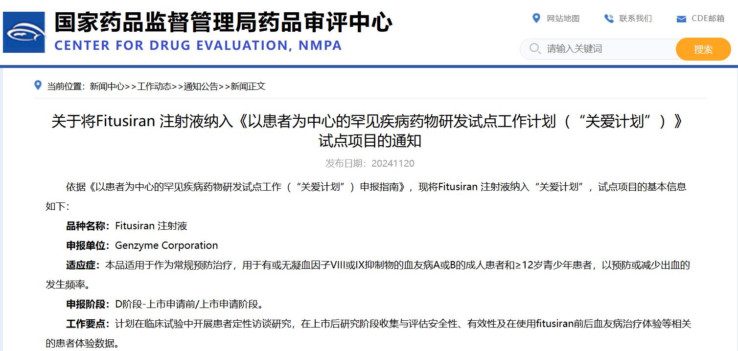 關于將Fitusiran 注射液納入《以患者為中心的罕見疾病藥物研發試點工作計劃(“關愛計劃”)》試點項目的通知