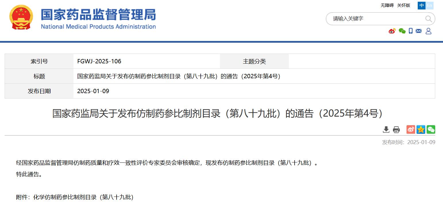 國家藥監局關于發布仿制藥參比制劑目錄(第八十九批)的通告(2025年第4號)
