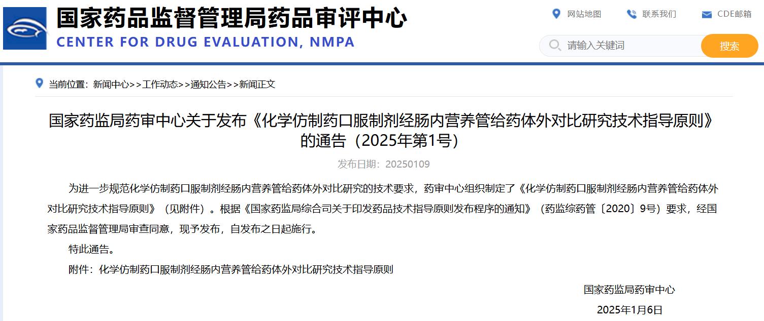 國家藥監局藥審中心關于發布《化學仿制藥口服制劑經腸內營養管給藥體外對比研究技術指導原則》的通告(2025年第1號)