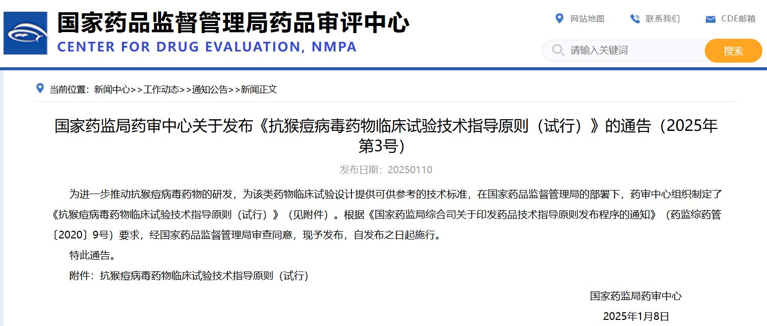 國家藥監局藥審中心關于發布《抗猴痘病毒藥物臨床試驗技術指導原則(試行)》的通告(2025年第3號)