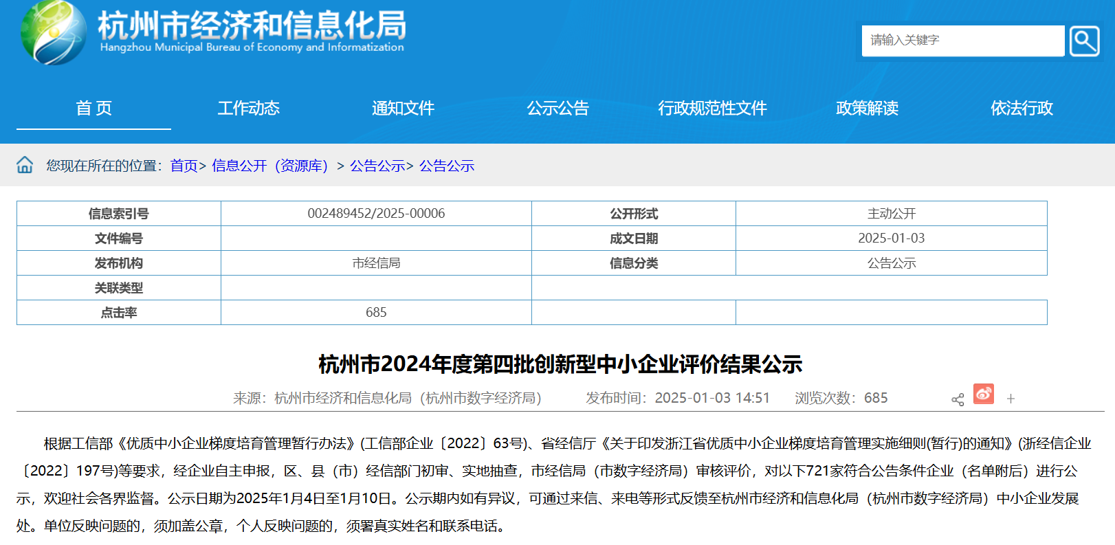 近日,杭州市經信局(市數字經濟局)對杭州市2024年度第四批創新型中小企業評價結果進行了公示。杭州康領先醫藥成功獲評 “杭州市創新型中小企業”稱號。