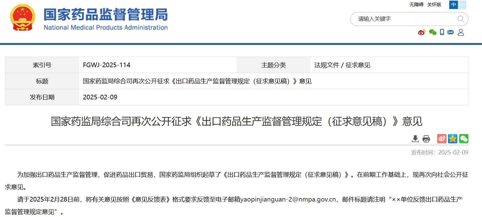 國家藥監局綜合司再次公開征求《出口藥品生產監督管理規定(征求意見稿)》意見