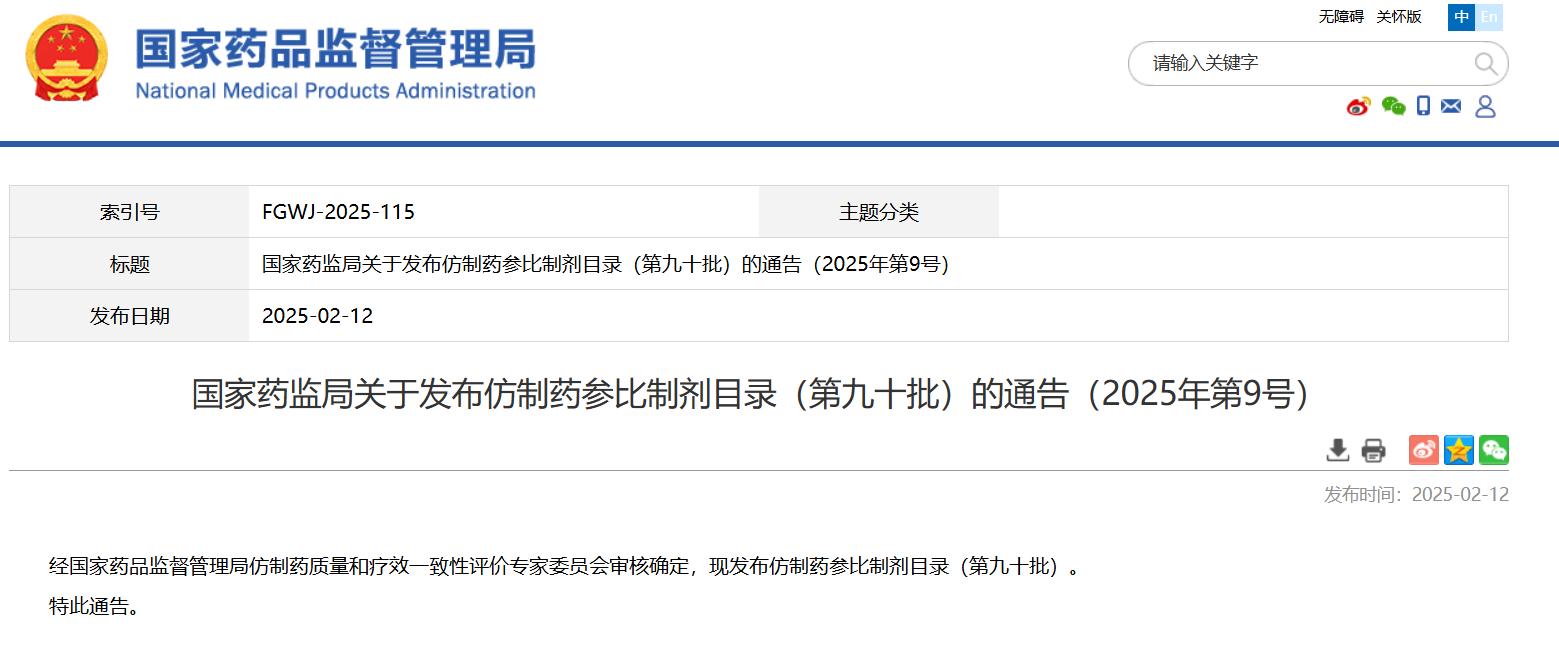 國家藥監局關于發布仿制藥參比制劑目錄(第九十批)的通告(2025年第9號)