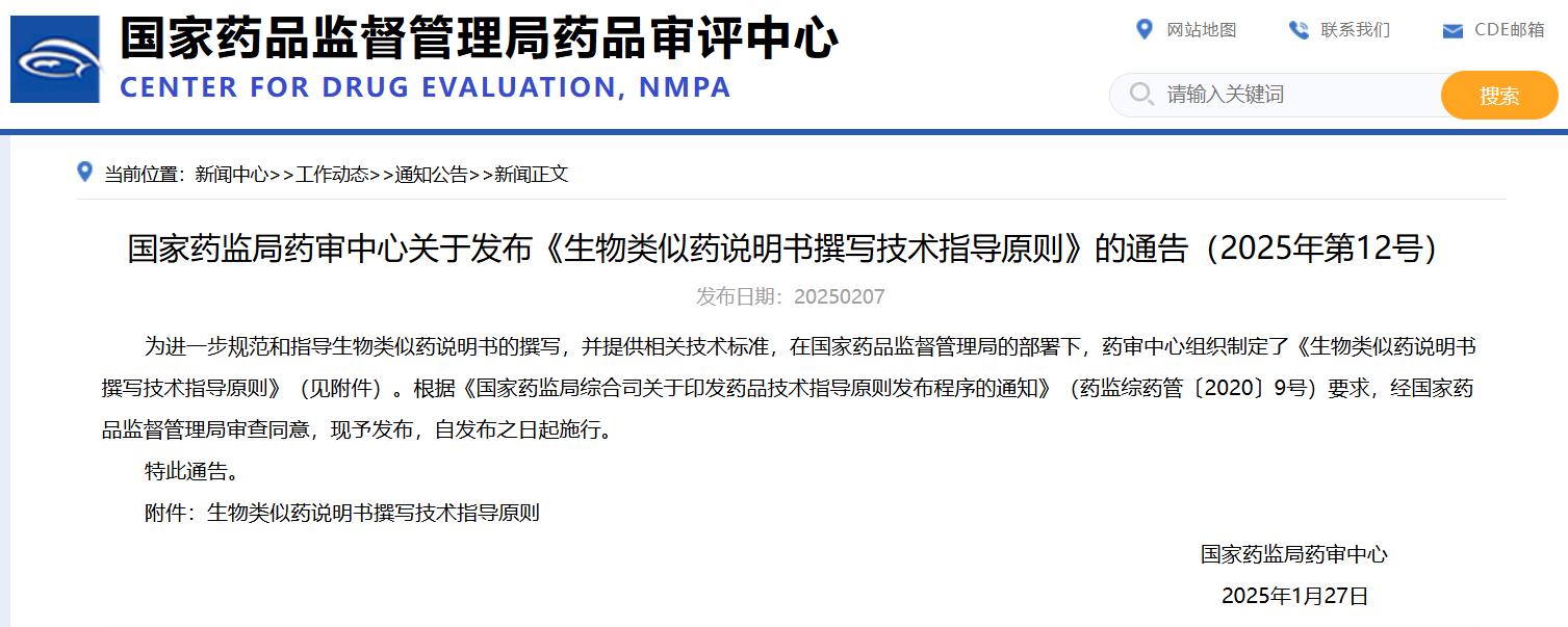 國家藥監局藥審中心關于發布《生物類似藥說明書撰寫技術指導原則》的通告(2025年第12號)