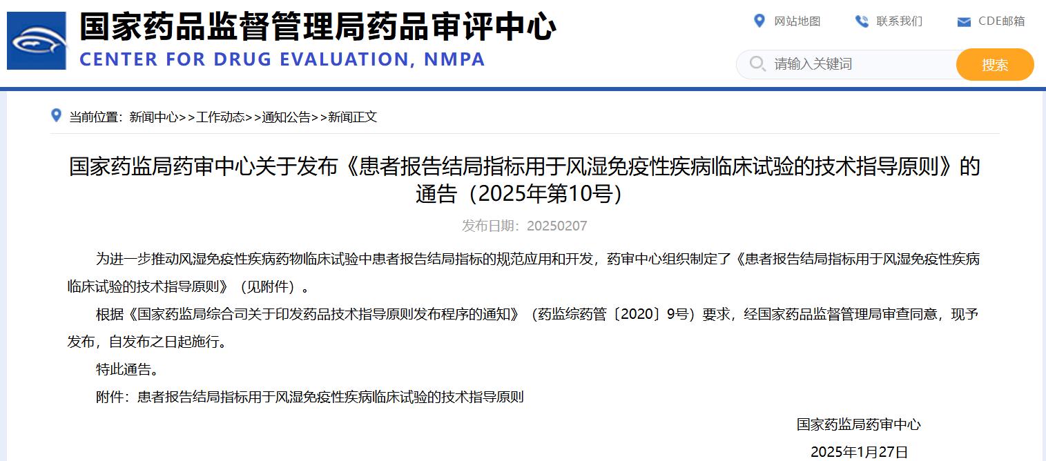 國家藥監局藥審中心關于發布《患者報告結局指標用于風濕免疫性疾病臨床試驗的技術指導原則》的通告(2025年第10號)