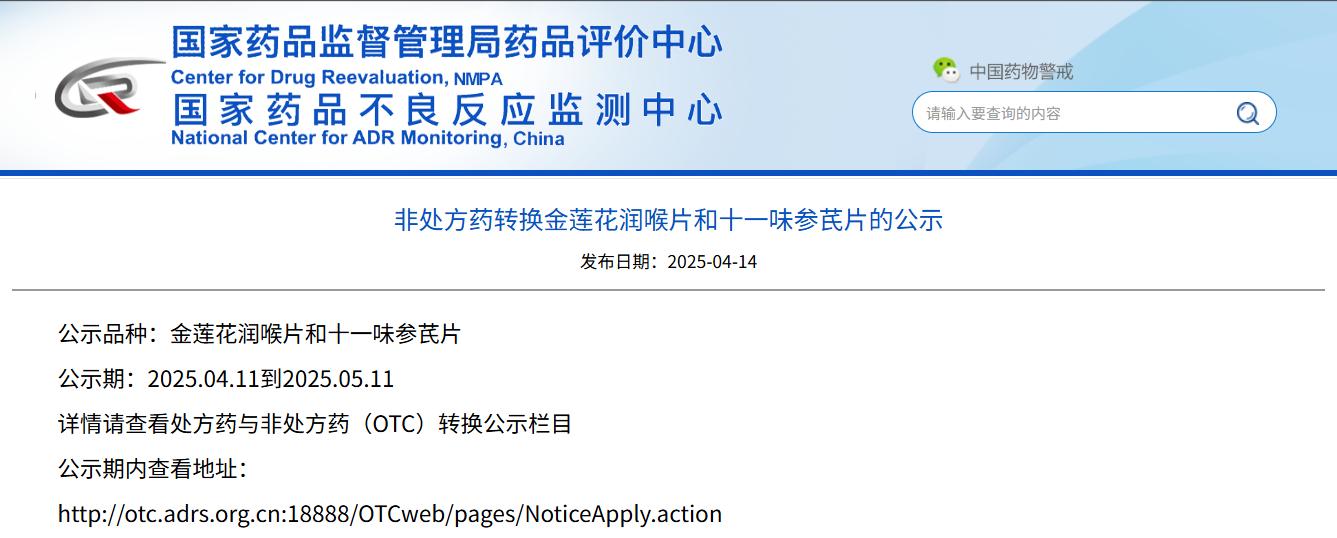 非處方藥轉換金蓮花潤喉片和十一味參芪片的公示
