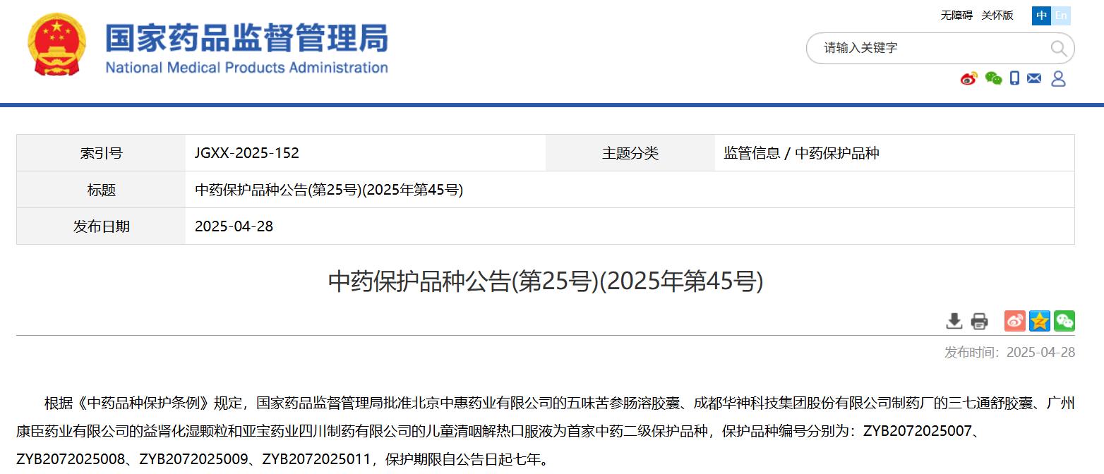 中藥保護品種公告(第25號)(2025年第45號)