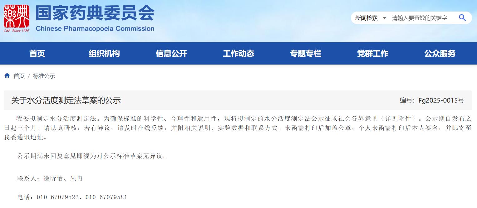 為確保標準的科學性、合理性和適用性,現將擬制定的水分活度測定法公示征求社會各界意見。