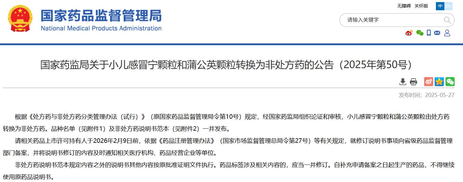 國家藥監局關于小兒感冒寧顆粒和蒲公英顆粒轉換為非處方藥的公告(2025年第50號)