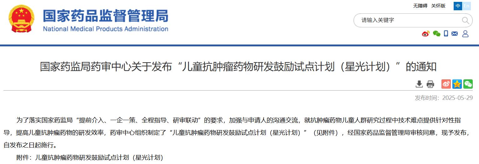 國家藥監局藥審中心關于發布“兒童抗腫瘤藥物研發鼓勵試點計劃(星光計劃)”的通知