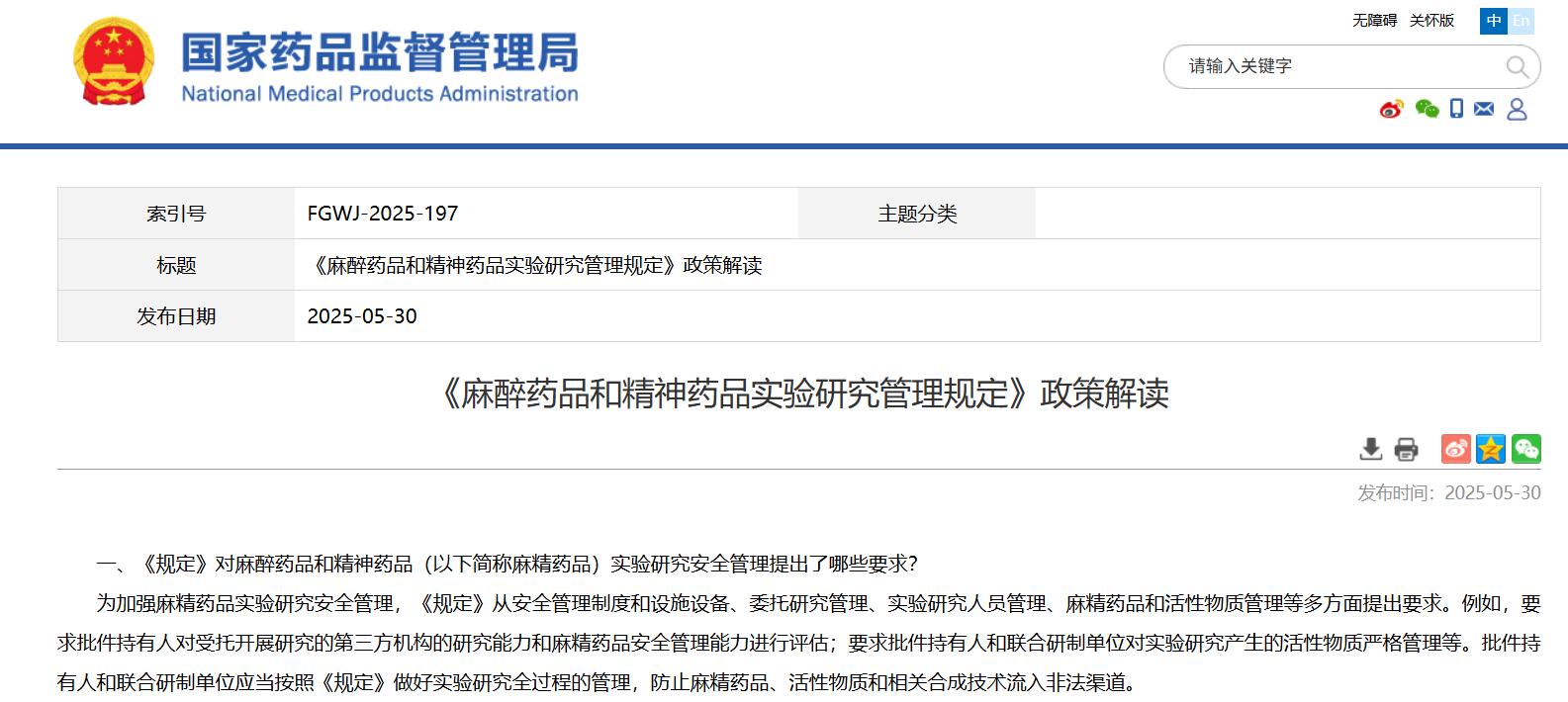 國家藥監局關于發布麻醉藥品和精神藥品實驗研究管理規定的公告(2025年第51號)