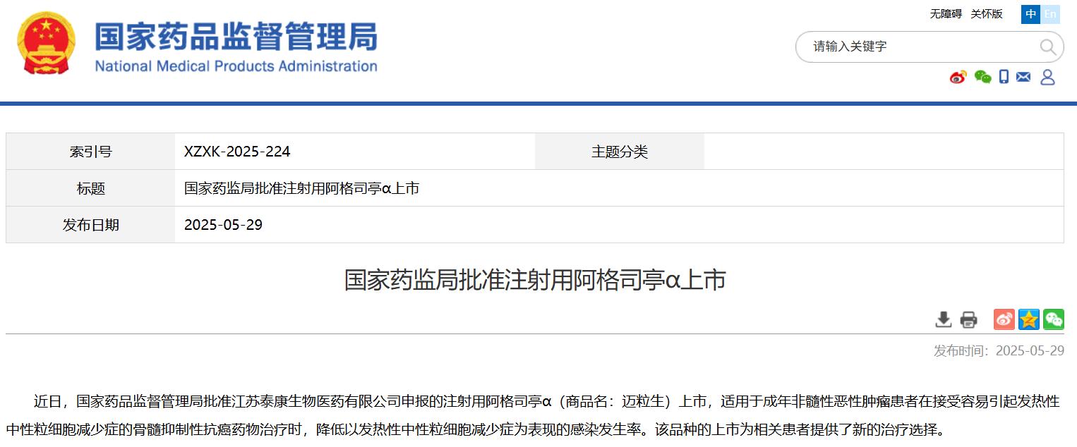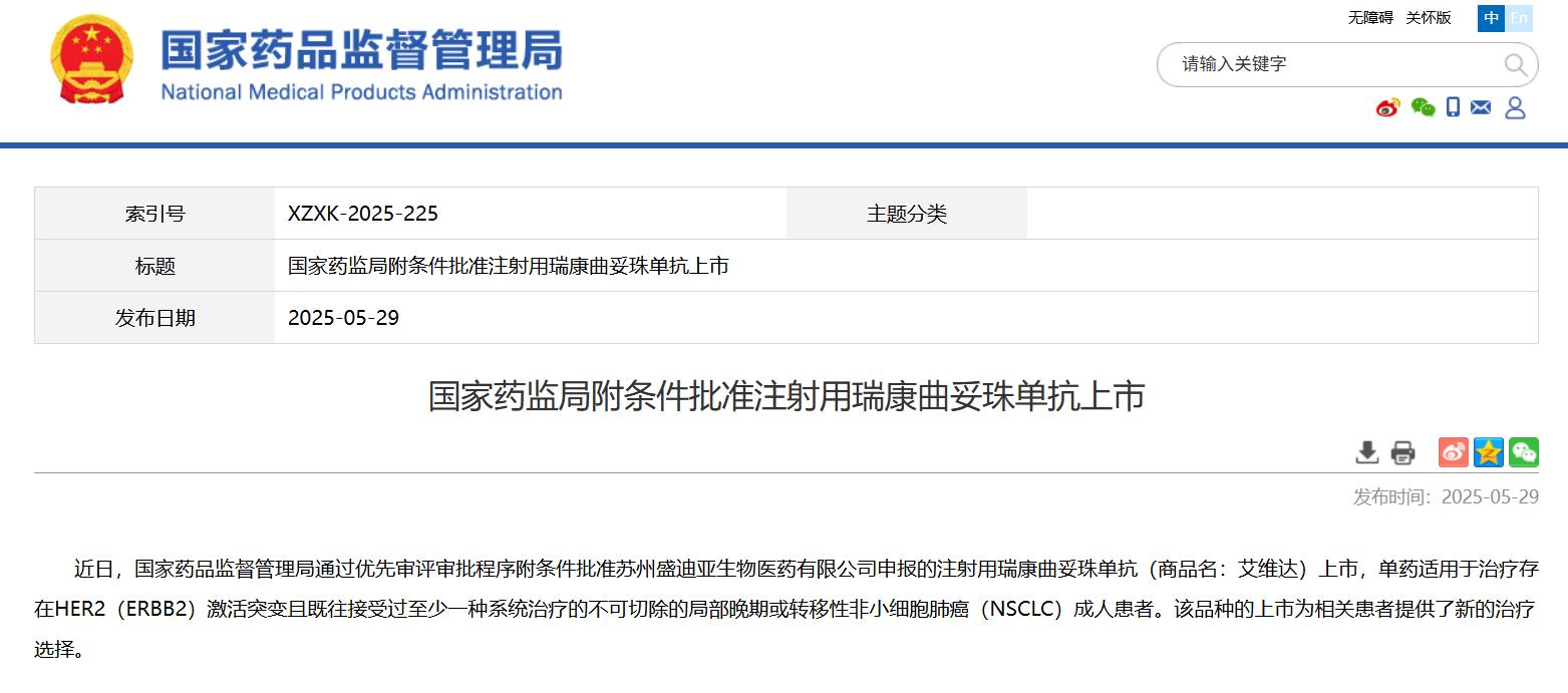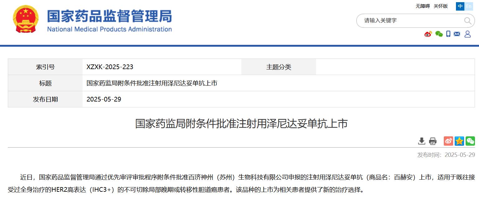 國家藥監局附條件批準注射用澤尼達妥單抗上市