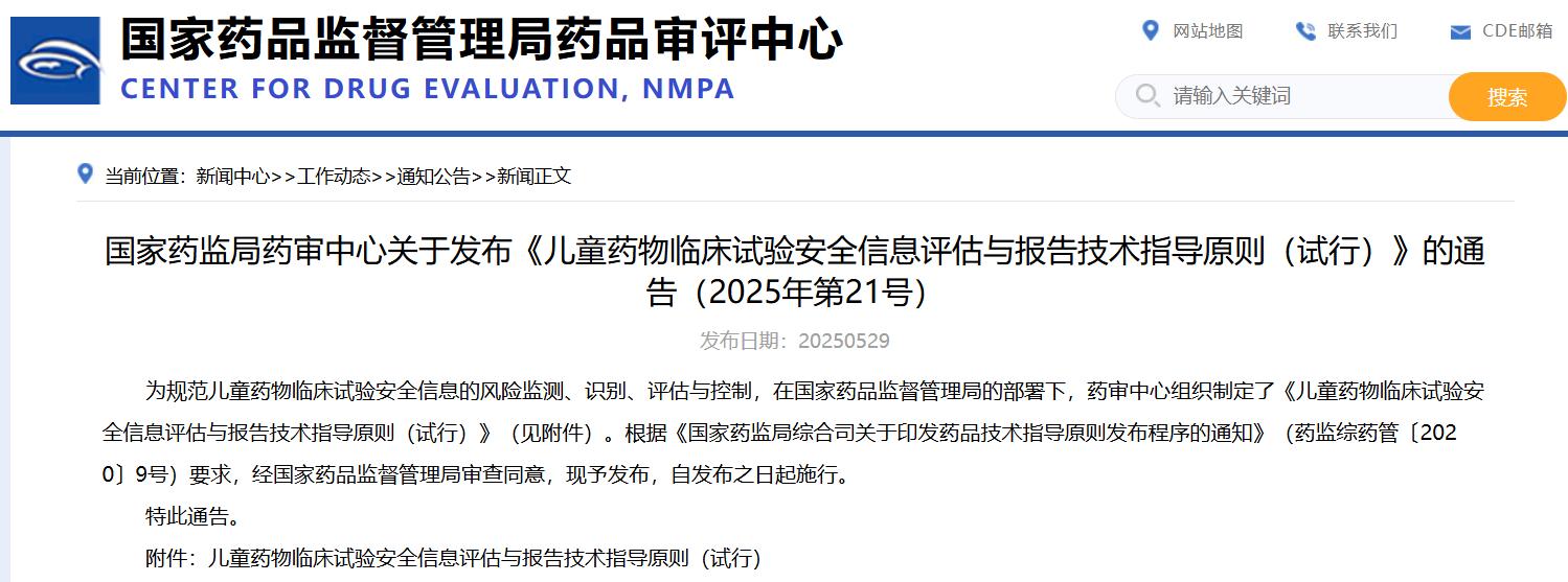 國家藥監局藥審中心關于發布《兒童藥物臨床試驗安全信息評估與報告技術指導原則(試行)》的通告(2025年第21號)