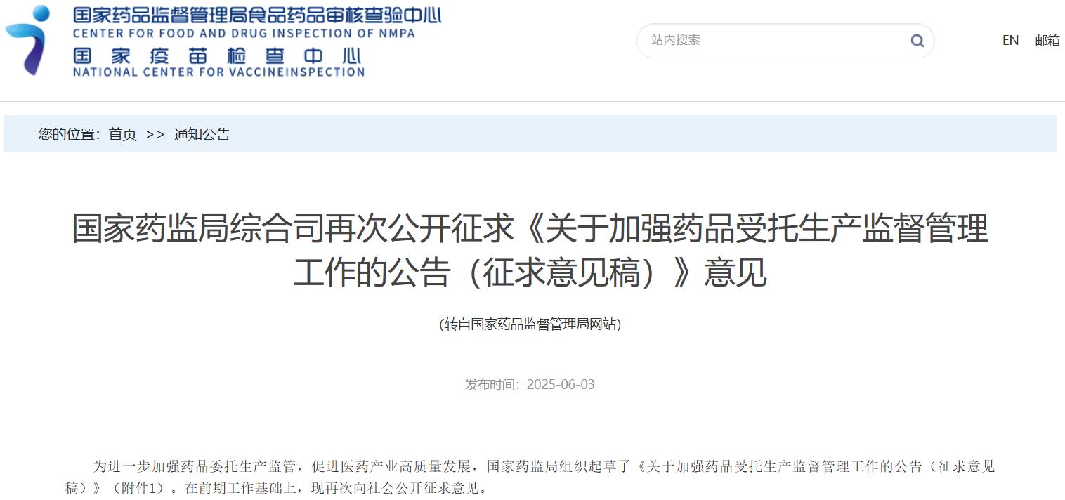 國家藥監(jiān)局綜合司再次公開征求《關(guān)于加強(qiáng)藥品受托生產(chǎn)監(jiān)督管理工作的公告(征求意見稿)》意見(轉(zhuǎn)自國家藥品監(jiān)督管理局網(wǎng)站)