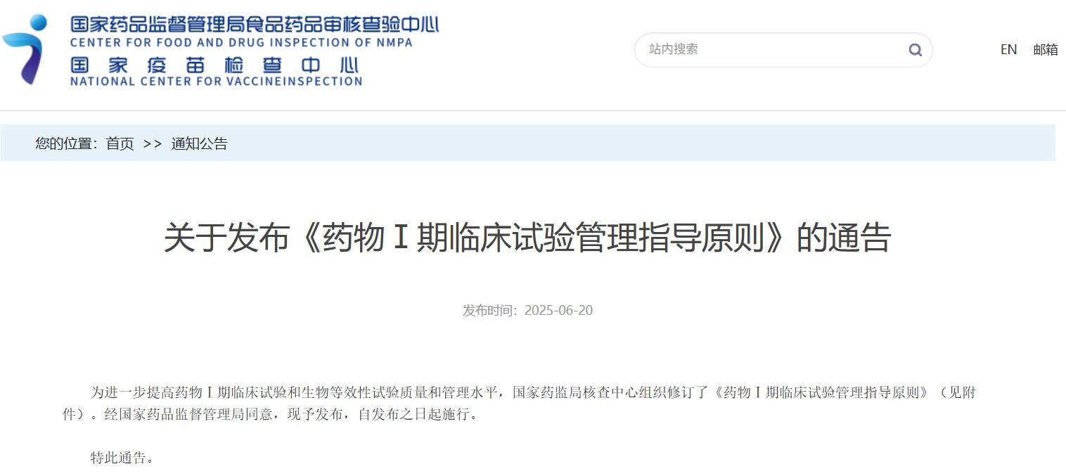 國家藥品監督管理局食品藥品審核查驗中心關于發布《藥物Ⅰ期臨床試驗管理指導原則》的通告