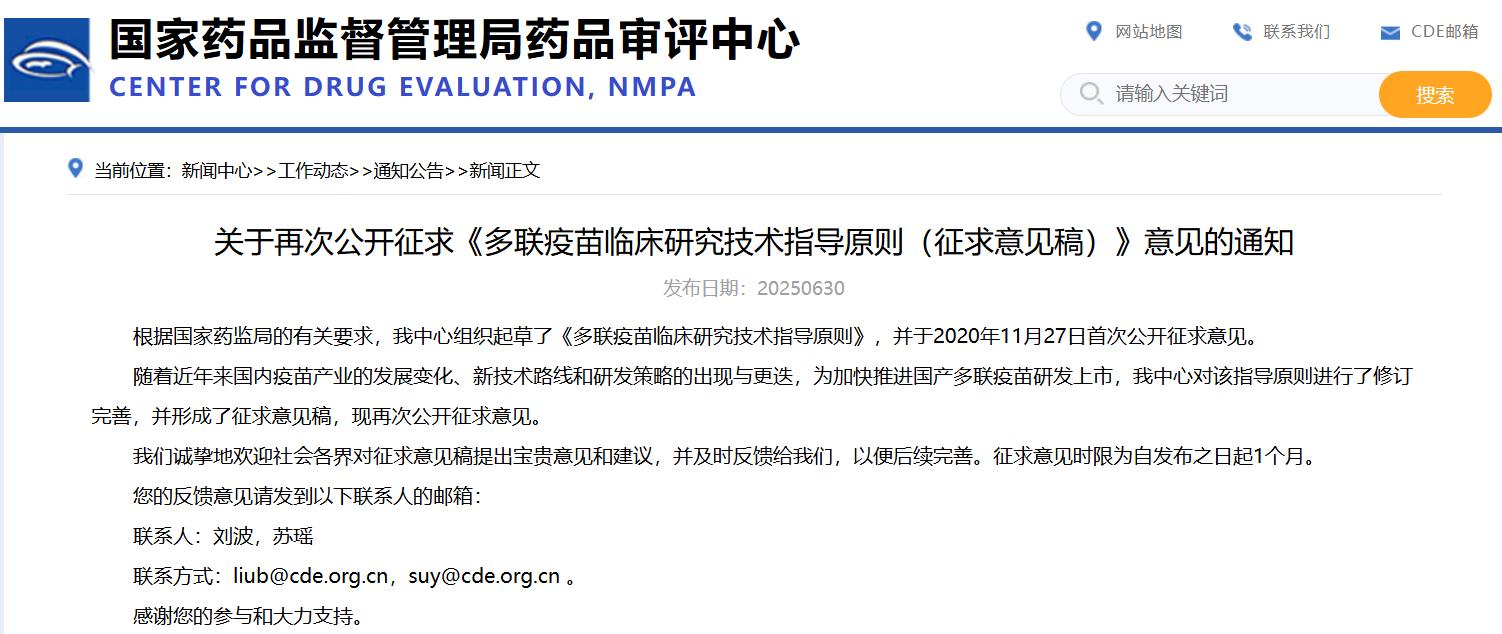 關于再次公開征求《多聯(lián)疫苗臨床研究技術指導原則(征求意見稿)》意見的通知