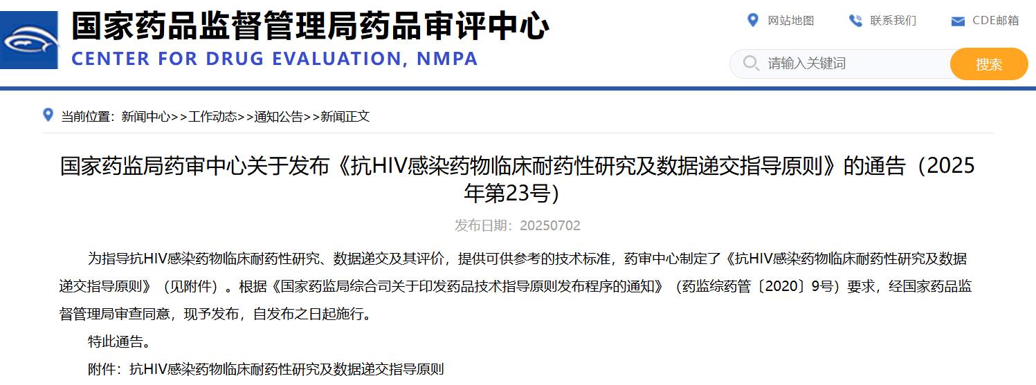 國家藥監(jiān)局藥審中心關于發(fā)布《抗HIV感染藥物臨床耐藥性研究及數據遞交指導原則》的通告(2025年第23號)