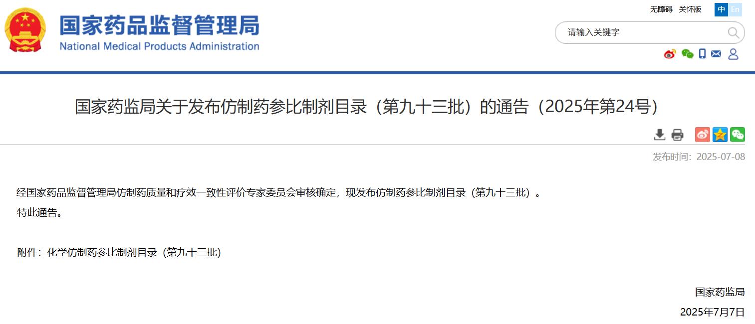 國家藥監局關于發布仿制藥參比制劑目錄(第九十三批)的通告(2025年第24號)