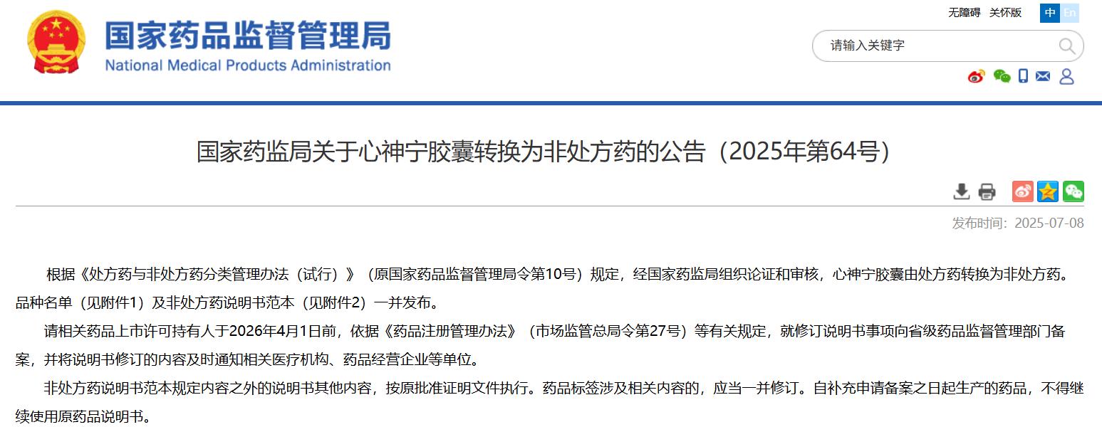 國家藥監局關于心神寧膠囊轉換為非處方藥的公告(2025年第64號)