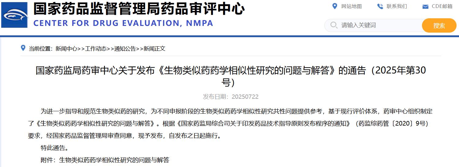 國家藥監(jiān)局藥審中心關于發(fā)布《生物類似藥藥學相似性研究的問題與解答》的通告(2025年第30號)