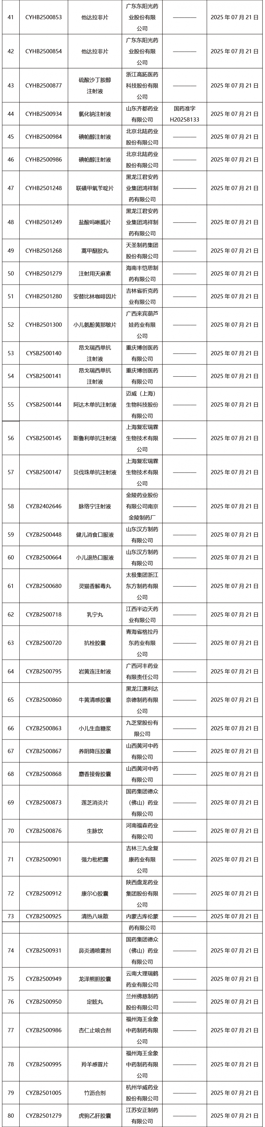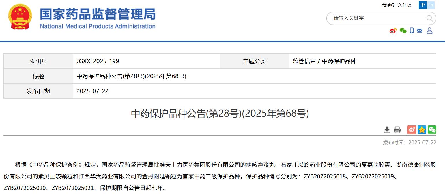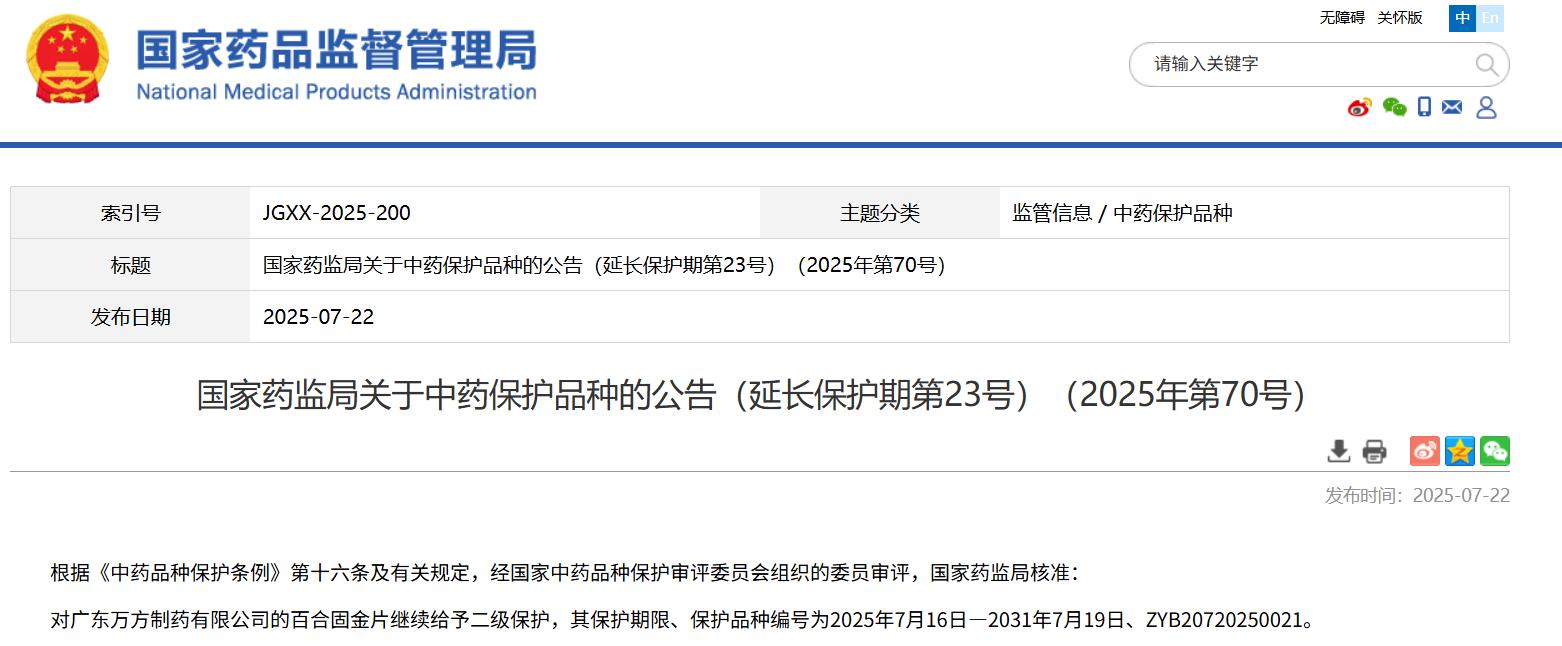 國家藥監(jiān)局關于中藥保護品種的公告(延長保護期第23號)(2025年第70號)