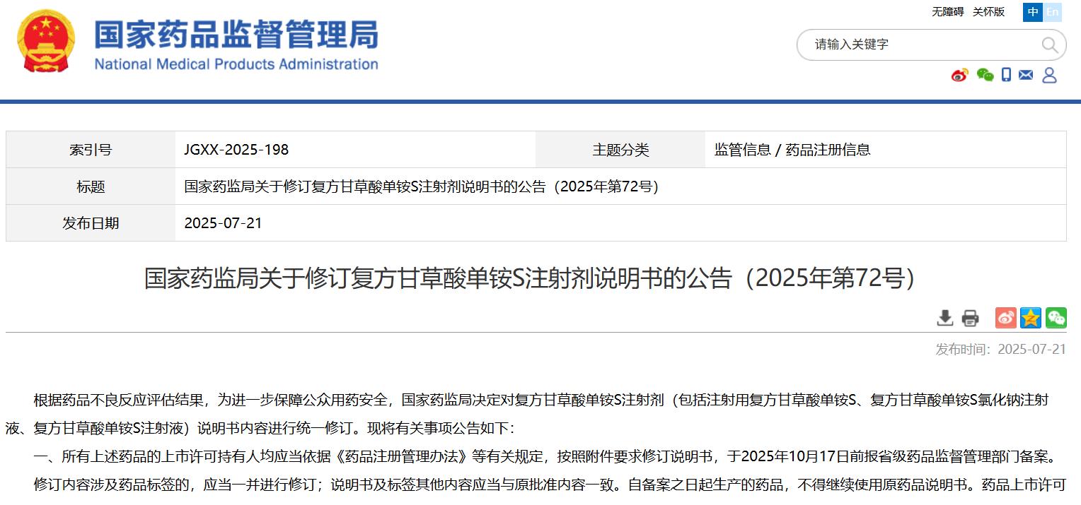 國家藥監(jiān)局關于修訂復方甘草酸單銨S注射劑說明書的公告(2025年第72號)