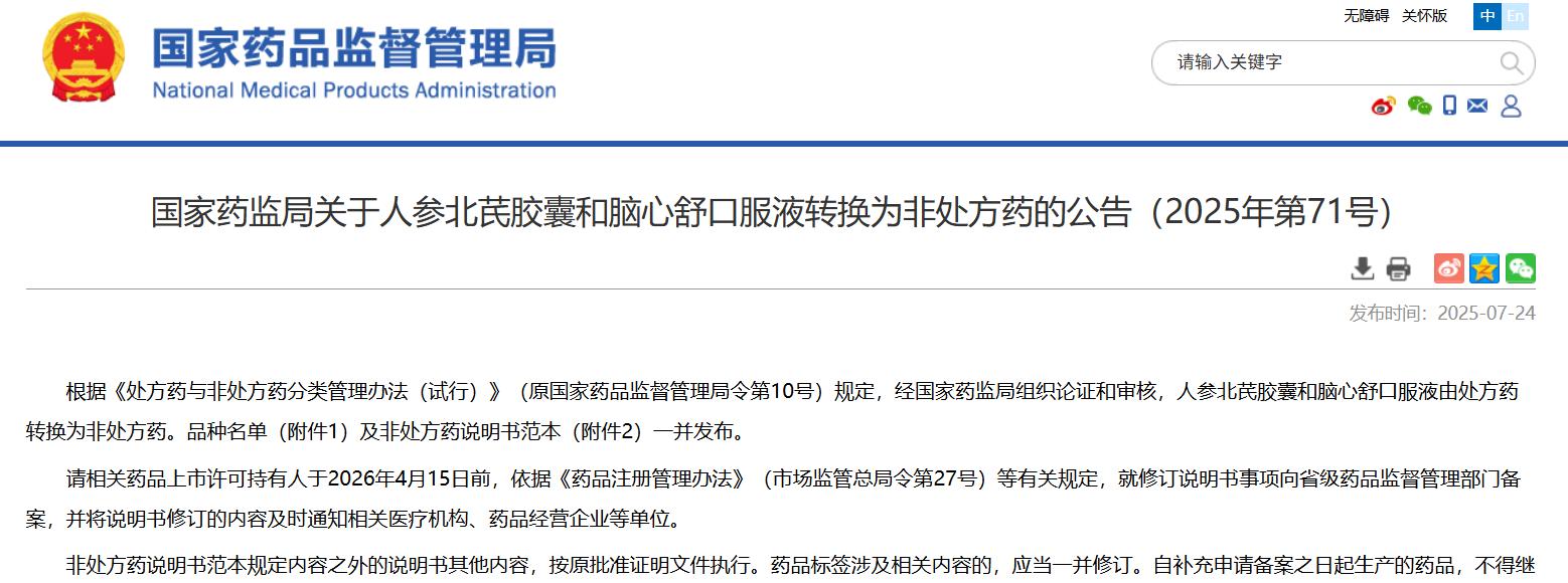 國家藥監(jiān)局關于人參北芪膠囊和腦心舒口服液轉(zhuǎn)換為非處方藥的公告(2025年第71號)