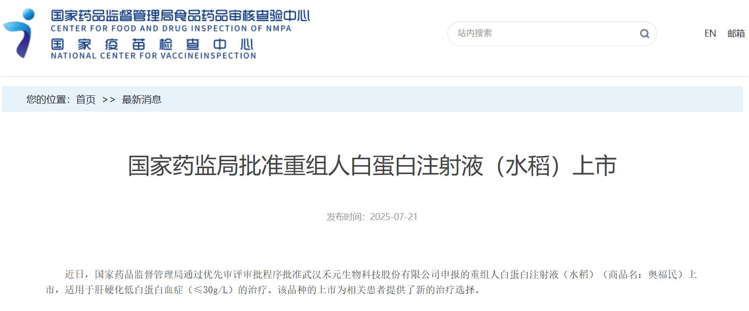 國家藥監(jiān)局批準重組人白蛋白注射液(水稻)上市