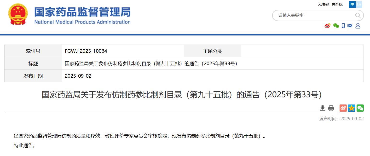 國家藥監局關于發布仿制藥參比制劑目錄(第九十五批)的通告(2025年第33號)