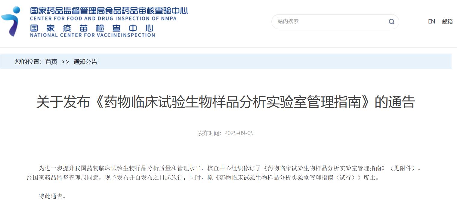 關于發布《藥物臨床試驗生物樣品分析實驗室管理指南》的通告