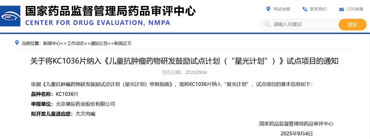 關于將KC1036片納入《兒童抗腫瘤藥物研發鼓勵試點計劃(“星光計劃”)》試點項目的通知