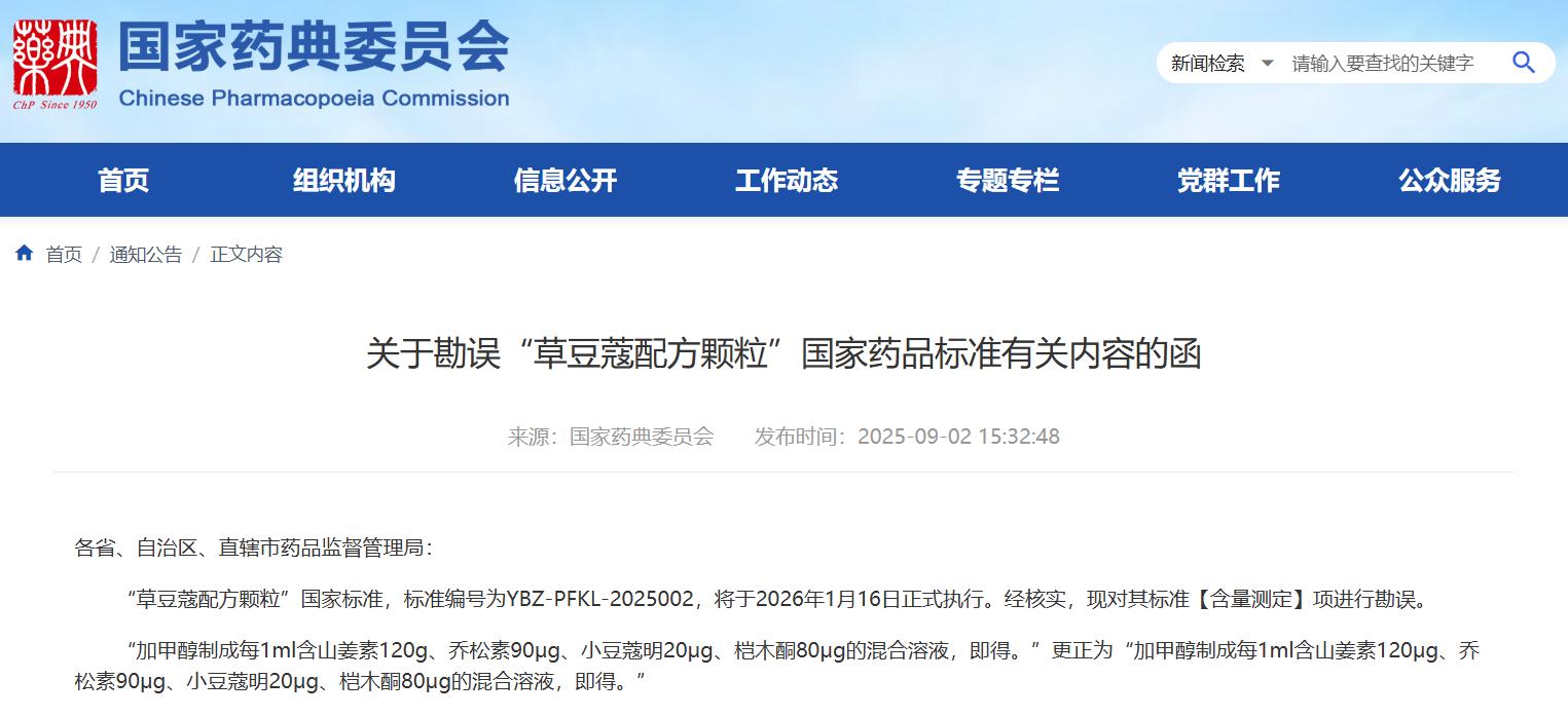 關于勘誤“草豆蔻配方顆粒”國家藥品標準有關內容的函