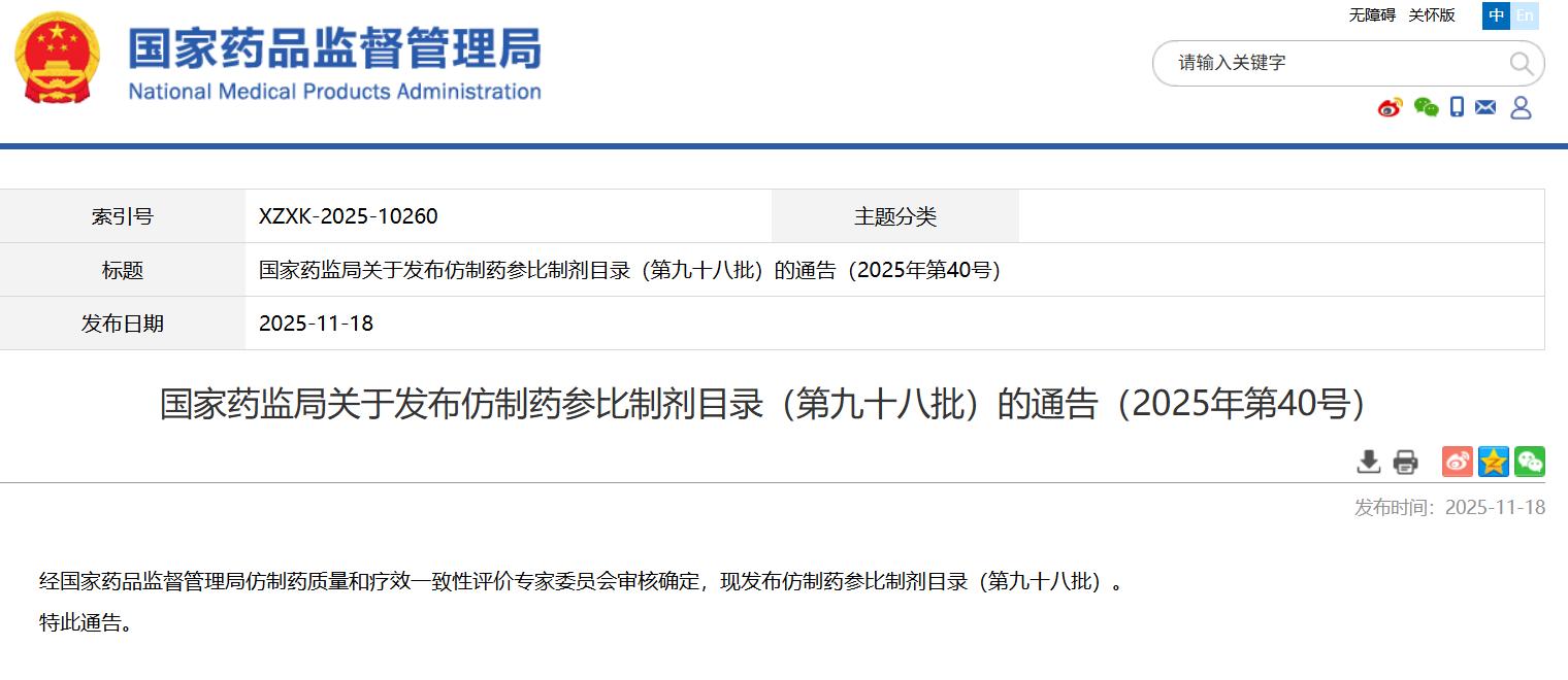 國家藥監局關于發布仿制藥參比制劑目錄(第九十八批)的通告(2025年第40號)