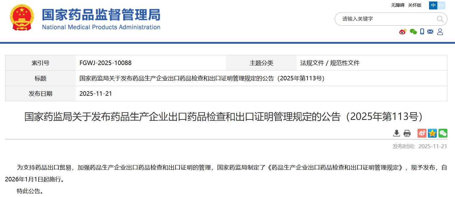 國家藥監局關于發布藥品生產企業出口藥品檢查和出口證明管理規定的公告(2025年第113號)