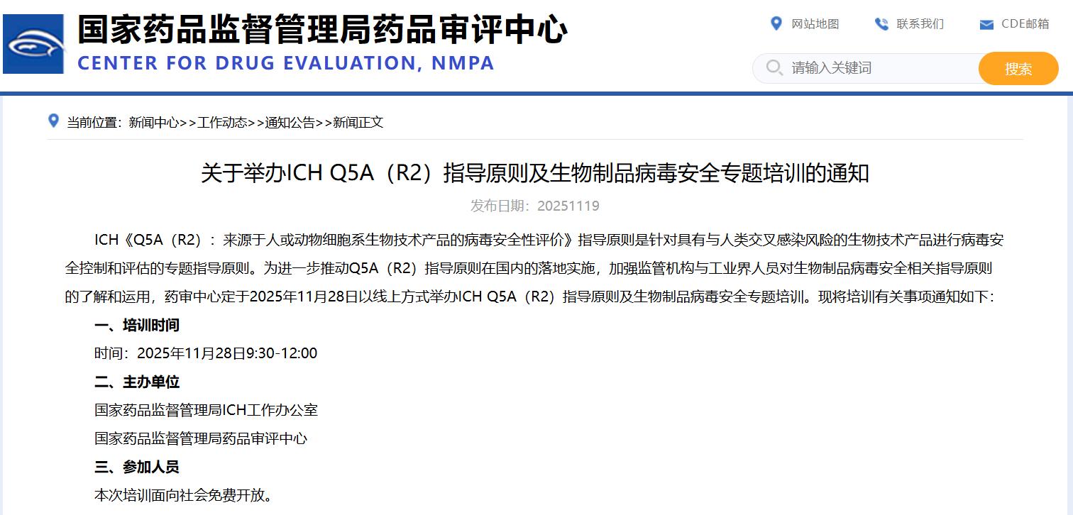 關于舉辦ICH Q5A(R2)指導原則及生物制品病毒安全專題培訓的通知