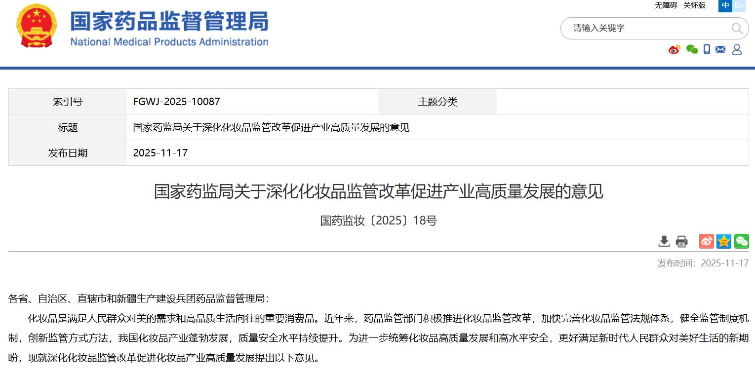 國家藥監局關于深化化妝品監管改革促進產業高質量發展的意見