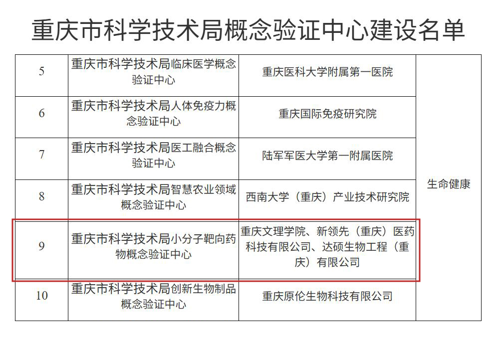 近日,重慶市科學技術局官網發布《關于公布重慶市科學技術局概念驗證中心建設名單的通知》,新領先(重慶)醫藥科技成功入選“重慶市科學技術局小分子靶向藥物概念驗證中心”依托單位。