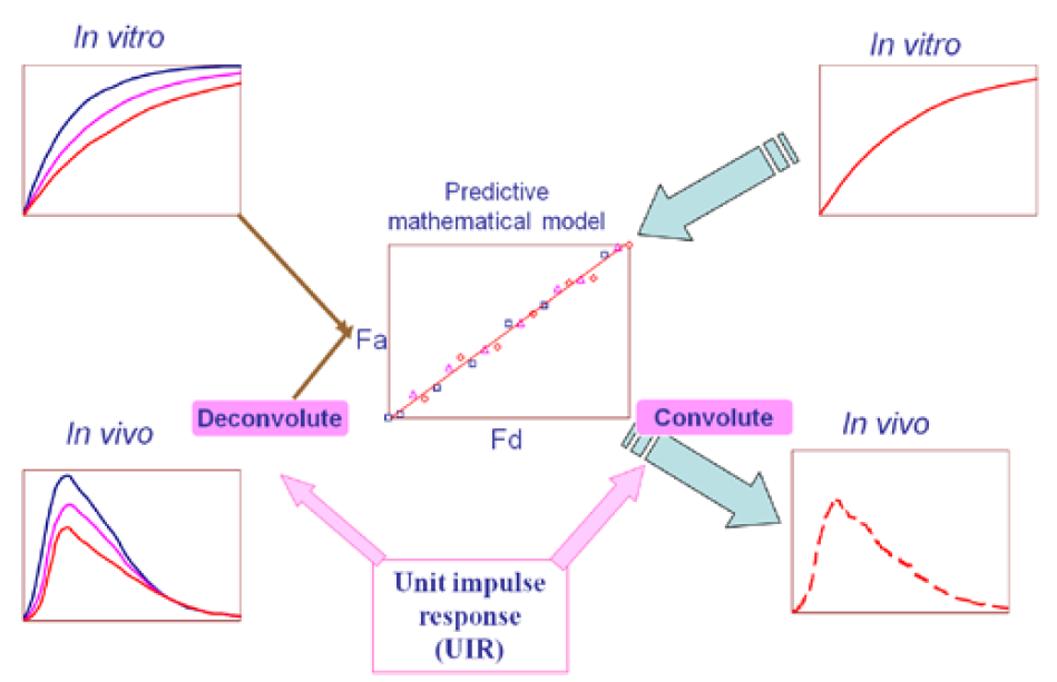 體內外相關性模型,用IVIVR(in-vivo and in-vivo relationship)來表示,即將藥品的體外特性(主要為溶出曲線)和體內特性(藥動學)建立相關性。根據體外溶出數據,預測藥物的在體內的藥動學曲線,該方法為卷積法。相反,利用藥物的吸收曲線,可預測藥物在體內的溶出,該方法為反卷積法,如下圖所示: