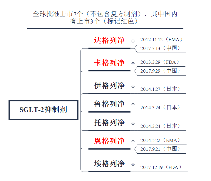SGLT-2抑制劑是一種近年來新型口服降糖藥的后起之秀,目前全球共批準7個品種上市(不包含復方制劑),其中國內上市3個,如下圖所示: