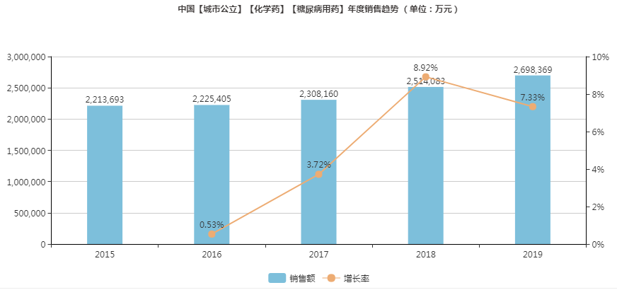 糖尿病是全球普遍流行的慢性疾病之一,據統計,目前全球約有4.63億人患有糖尿病。我國糖尿病人數高達1.14億,患病率近年維持在11%左右。據米內網統計數據顯示,2019年中國城市公立醫院終端糖尿病治療藥物市場規模約270億元(渠道格局占比47.19%),測算全國醫院市場規模高達572億元。