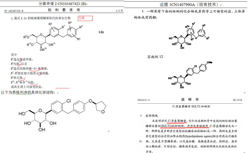 分案2(423B)無效基于的主要理由是不符合專利第22條第3款創造性的規定,采用的證據為CN1407990A,該專利中公開了一種具有SGLT-2抑制活性的式I結構吡喃葡萄糖取代的苯衍生物,并且具體公開了實施例12的化合物。此外,證據1還公開了上述化合物為在腸和腎中的鈉依賴型葡萄糖轉運蛋白SGLT-2的抑制劑。