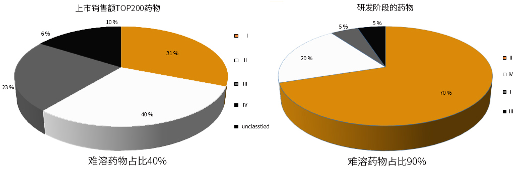 隨著高通量篩選方法在藥物研發中的應用,涌現了很多分子量較大,結構復雜的化合物。文獻報道顯示,目前處于研發階段的藥物,難溶藥物的比例高達90%。如何提高難溶性藥物的溶解度和生物利用度是藥劑工作者面臨的具體挑戰之一。