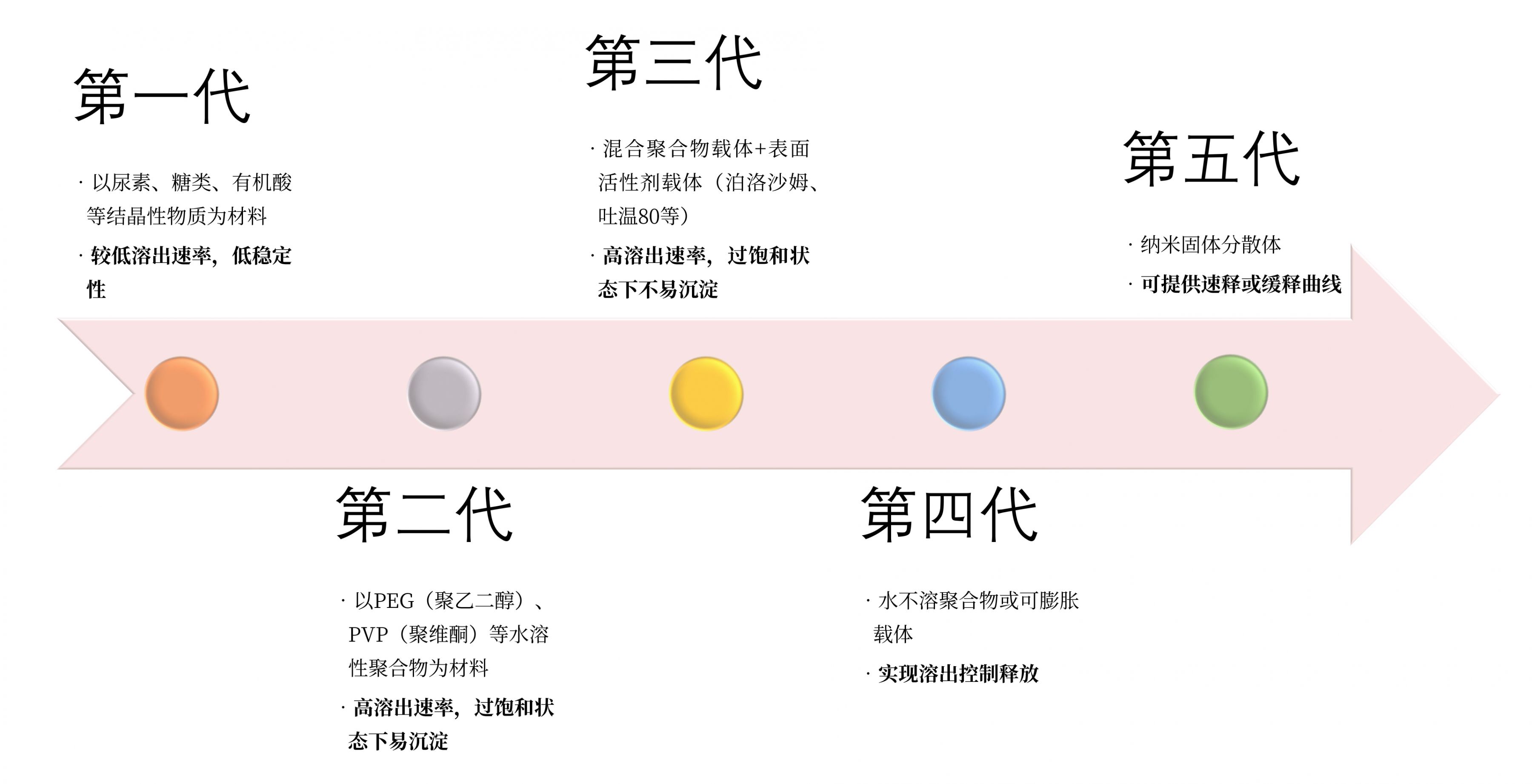 固體分散體的概念最早由 Sekiguchi 和 Obi 提出,時至今日已近60年,在此期間,固體分散體已經發展了五代,如下圖所示: