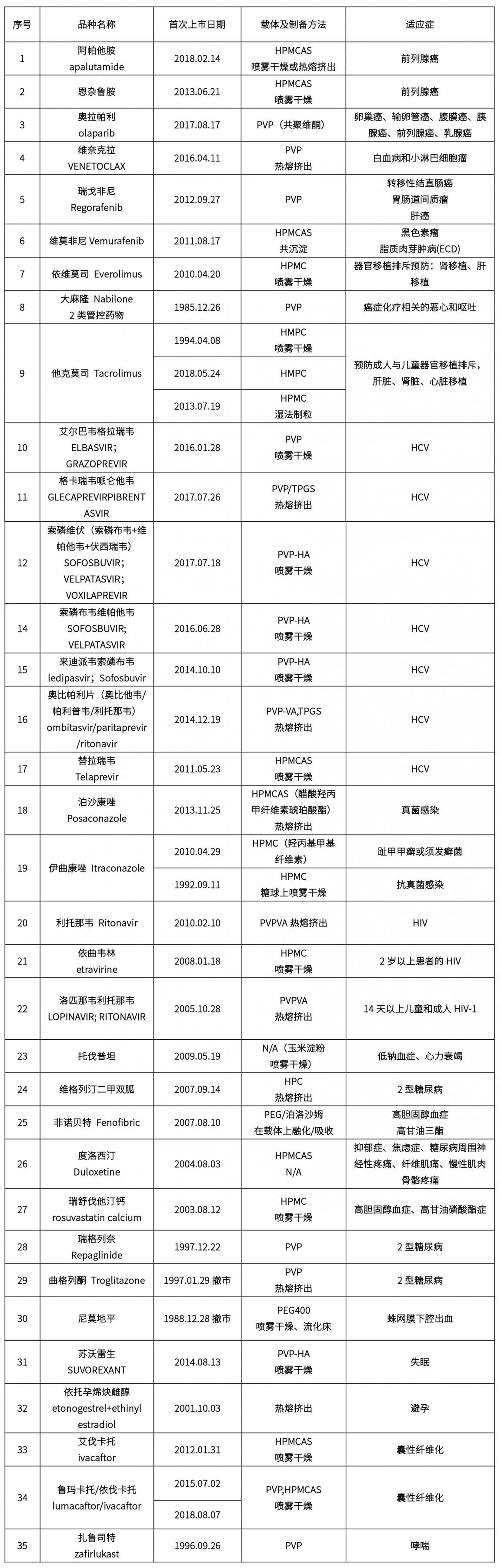 固體分散體獲批上市品種主要集中在3個領域:抗腫瘤與免疫抑制領域、心血管領域、抗感染領域。據不完全統計,目前獲批上市品種超35個。