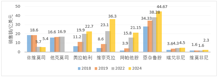 目前,上市的固體分散體品種有多個重磅品種,尤其是抗腫瘤與免疫抑制領域。該領域品種絕大多數為重磅品種,2019年銷售額已超10億美元的品種為依維莫司、他克莫司、奧拉帕利、恩雜魯胺;2024年預測銷售額超40億美元的為恩雜魯胺,超30億美元的是維萘克拉、超20億美元的為奧拉帕利。其市場銷售額及預測如下所示:
