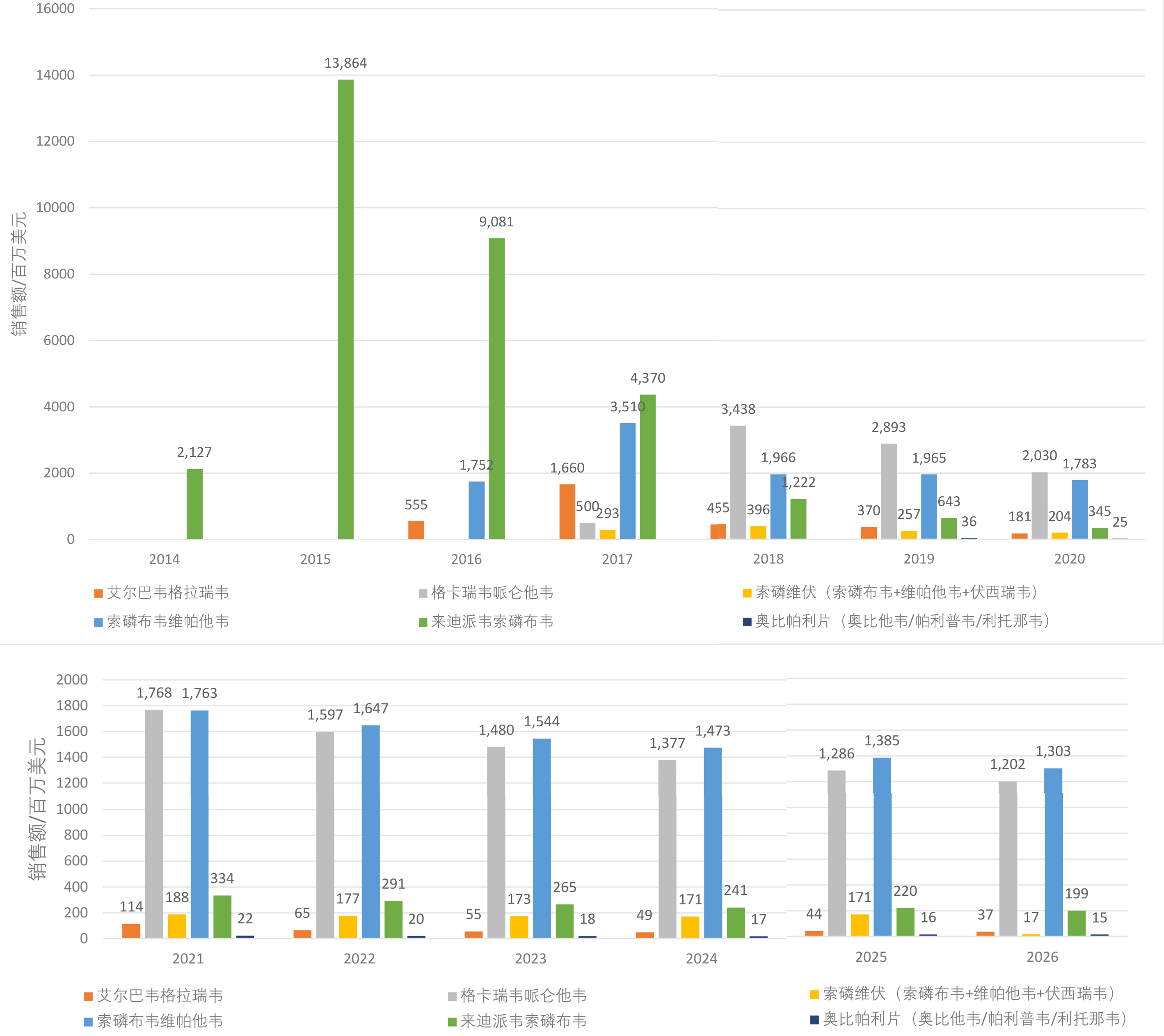 該領域品種中7個丙型肝炎病毒(HCV)品種,其中來迪派韋索磷布韋的銷售峰值高達138億美元,全球市場分析與預測如下所示: